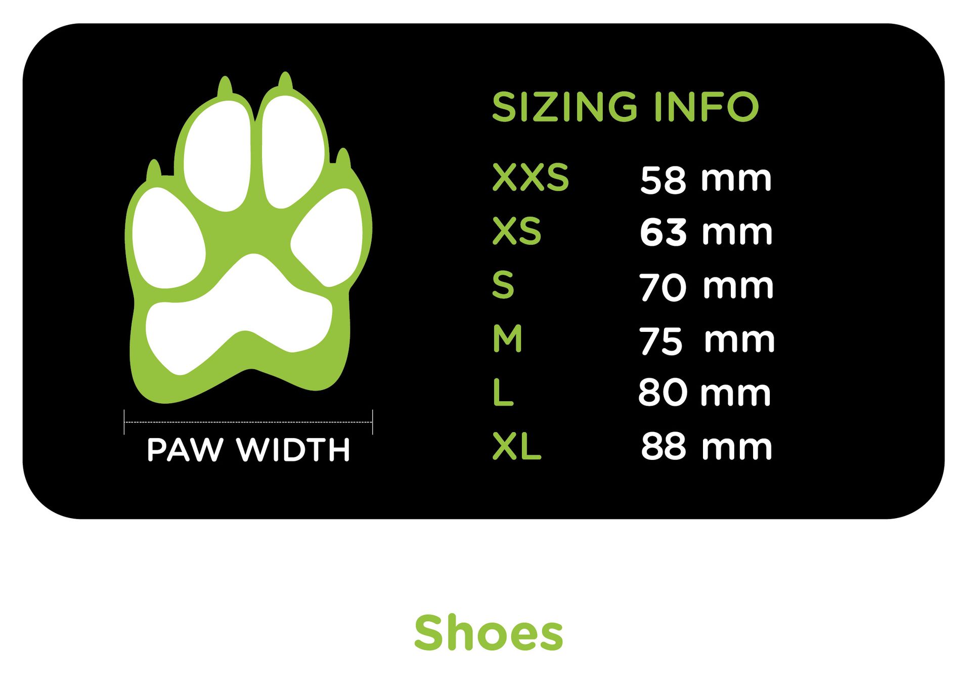 Um die richtige Größe zu finden stellen Sie die Pfote Ihres Hundes, für die der Schuh benötigt wird, auf ein Blatt Papier und markieren jeweils den hintersten und vordersten Aufstandspunkt der Pfote auf dem Papier. Anschließend messen Sie den Abstand zwischen den Punkten und wählen die enstprechende Größe. ACHTUNG - meist sind die hinteren Pfoten etwas kleiner als die vorderen, so dass verschiedene Größen benötigt werden.