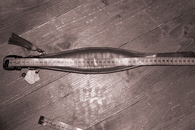 Hier zeigen wir unsere Messmethode für die Angabe der Halsbandlängen. Sie können so auch testen, in welcher Größe Ihr Wunschhalsband Ihrem Hund passen könnte. Das von Ihnen ermittelte Maß sollte möglichst in der Mitte unserer Längenangaben (s. o.) liegen.