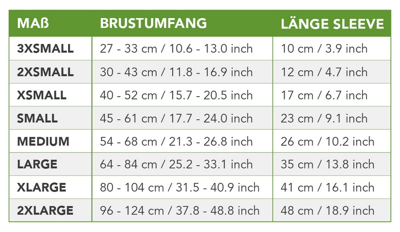 Bitte messen Sie für das Recovery Double Sleeve® den Brustumfang Ihres Hundes hinter den Vorderbeinen ohne Zugaben und die Beinlänge auf der Rückseite des Beines vom Ellbogen bis ca. Fessel. Ausschlaggebend für den richtigen Sitz und damit Schutz ist der Brustumfang. Somit fällte der Beinling bei Hunden mit sehr langen Beinen natürlich im Bein länger aus, als bei Hunden mit kürzeren Beinen bei gleichem Brustumfang. Wenn der Brustumfang zwischen zwei Größen liegt, raten wir zur kleineren Größe, da sich das Sleeve sehr dehnt und ansonsten evtl. zu groß wird und nicht richtig schützen kann.